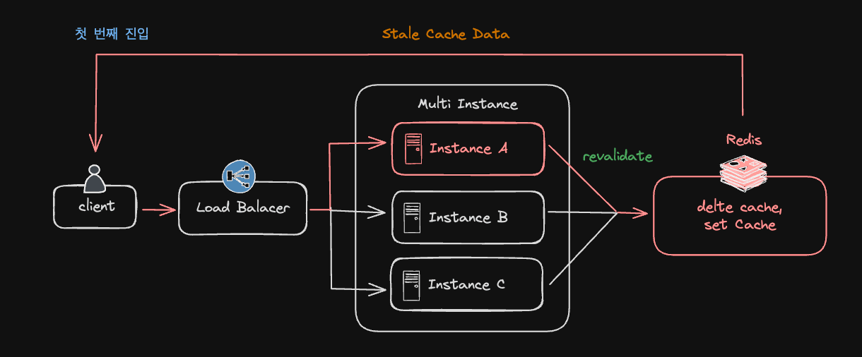 첫 번째 진입 시 특정 인스턴스에서 revalidate를 실행하면 Redis에 있는 Cache가 purge 되고 새롭게 set 합니다.