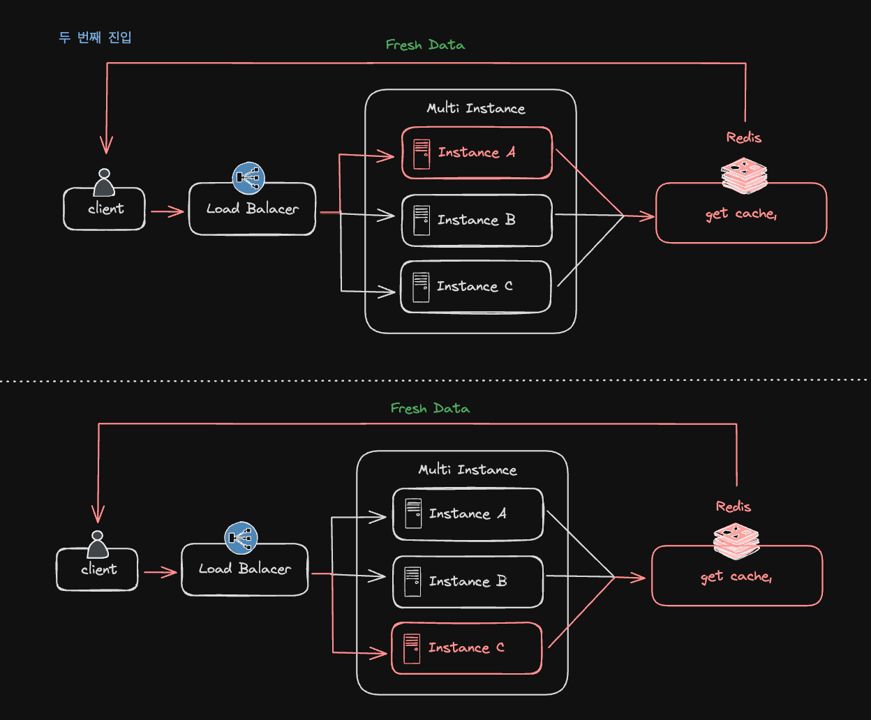 이제 인스턴스 내부의 메모리가 아닌 Redis를 이용한 공통 캐시 저장소를 이용합니다. 아키텍처 다이어그램은 다음과 같습니다.
